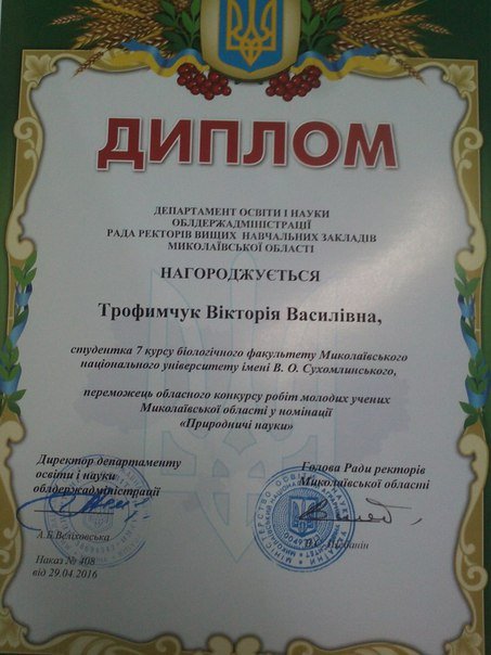 Вітаємо Трофимчук Вікторію з перемогою в обласному конкурсі робіт молодих вчених. Так тримати! Бажаємо успіхів  у навчанні!