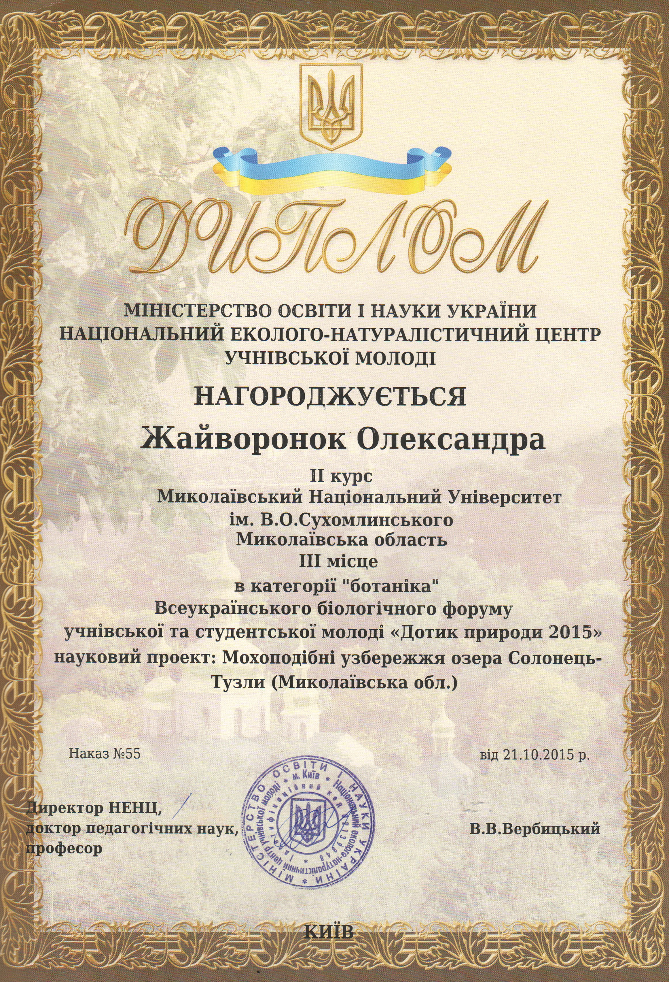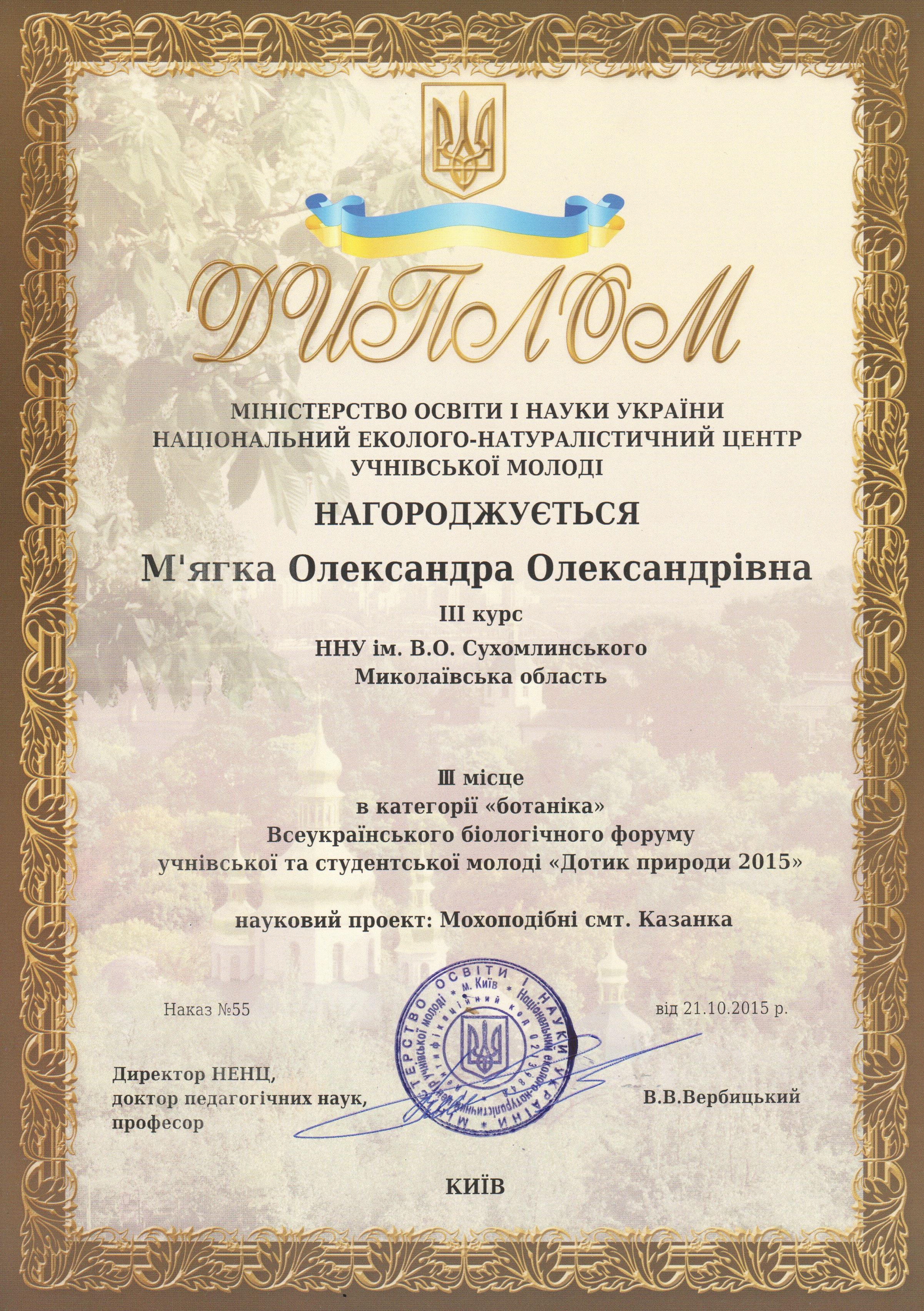 Національний еколого-натуралістичний центр учнівської молоді Міністерства освіти і науки України з метою виявлення та підтримки обдарованої студентської та учнівської молоді, примноження інтелектуального потенціалу держави, підготовки майбутньої наукової зміни, сприяння переходу України на інноваційний шлях розвитку, поліпшення якості природничої освіти 19-21 жовтня 2015 р. в м. Києві провели черговий Всеукраїнський форум учнівської та студентської молоді «Дотик природи».