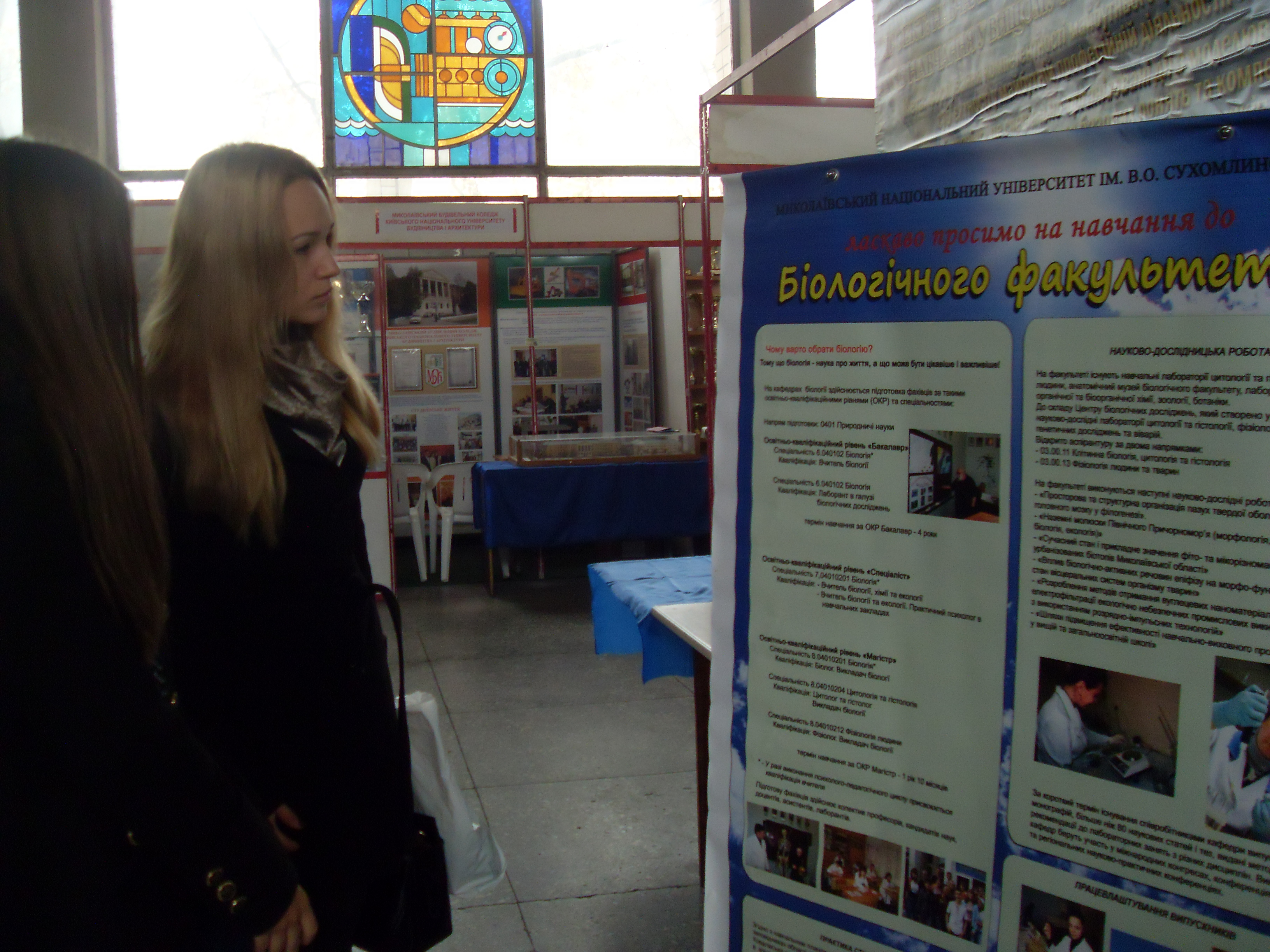 Департамент освіти, науки та молоді Миколаївської облдержадміністрації та ТОВ "НарімЕкспо" організували XIV спеціалізовану виставку "Освіта у 2016 році", яка діяла з 4 по 6 листопада 2015 р. У виставці прийняли участь всі вищі навчальні, професійні та комерційні заклади Миколаєва. У тому числі - МНУ ім. В.О. Сухомлинського. Викладачі нашого факультету та магістри мали можливість представити науково-дослідну та виховну роботу біологічного факультету, запрошуючи абітурієнтів до вступу до нашого вузу у 2016 р.