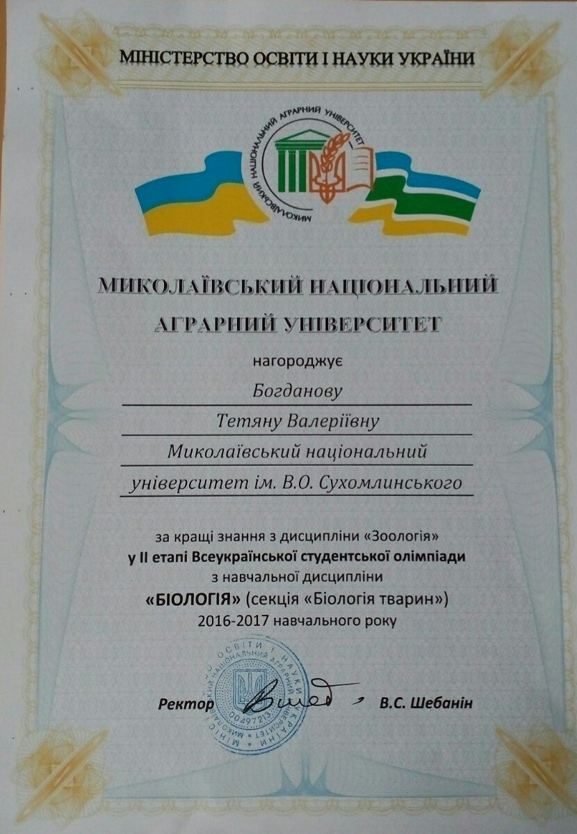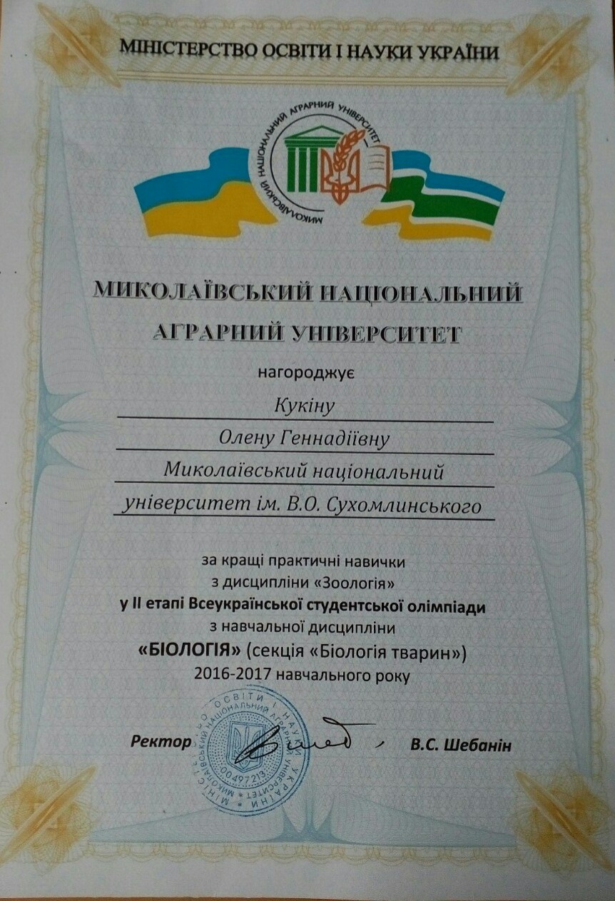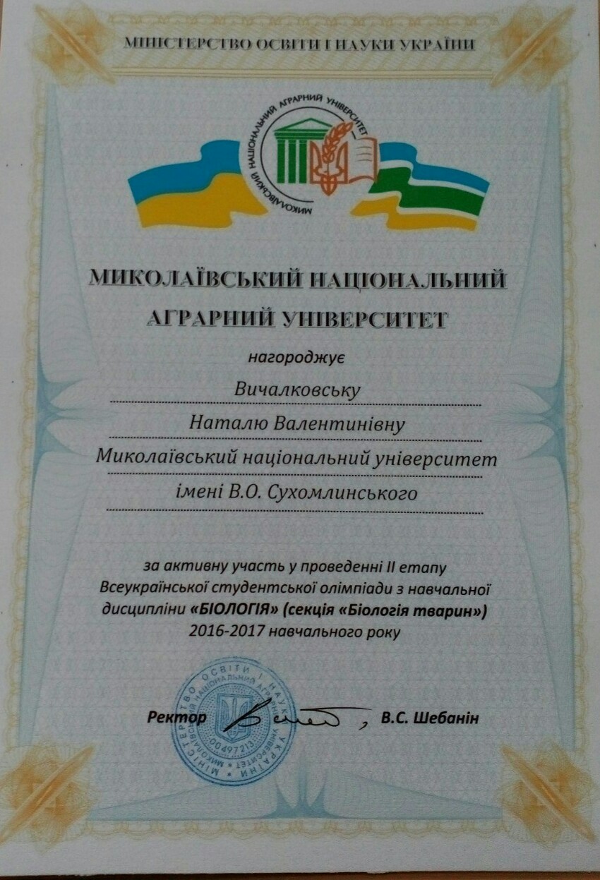 13-14 квітня 2017 р. студенти та викладачі біологічного факультету Миколаївського національного університету ім. В.О. Сухомлинського прийняли активну участь у ІІ етапі Всеукраїнської студентської олімпіади із диципліни „Біологія” за напрямами „Біологія рослин” та „Біологія тварин”. Програма олімпіади включала виконання теоретичних завдань, виконання тестів, практичні випробування, екскурсії. Всі студенти біологічного факультету, що прийняли участь були нагороджені почесними грамотами у різних номінаціях. Вітаємо Богданову Тетяну (430 група) з І місцем у тестуванні (секція „Біологія тварин”), Кукіну Олену (430 група) з відзнакою за кращі практичні знання з зоології (секція „Біологія тварин”), Юсковець Вікторію (320 група) з відзнакою за кращі теоретичні знання з фізіології рослин (секція „Біологія рослин”).