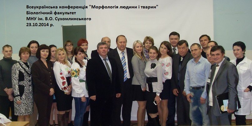 23 - 24 жовтня на біологічному факультеті відбулася Всеукраїнська конференція "Морфологія людини та тварин", на якій були присутніми гості-поофесори з різних куточків України, студенти, магістранти та науковці нашого рідного Миколаєва. У перший день конференції відбулося знайомство шановних гостей з нашим факультетом та пленарне засідання. Другого дня пройшла робота за секціями. За час конференції виступили д.м.н., професор, завідувач кафедри фізичної реабілітації ЧДУ ім. Петра Могили м. Миколаєва Зюзін В.О.; д.м.н., професор, завідувач кафедри цитології, гістології та ембріології ДВНЗ "Українська медична стоматологічна академія" Шепітько В.І.; д.м.н., професор, завідувач кафедри загальної та оперативної хірургії з топографічною анатомією Луганського державного навчального медичного університету Вовк Ю.М. (з недавніх пір професор і нашого факультету також); д.м.н., доцент, завідувач кафедри біології людини та тварин МНУ ім. В.О. Сухомлинського Авраменко А.О.; д.м.н., професор, завідувач кафедри патофізіології ДВНЗ "Українська медична стоматологічна академія" Костенко В.О. та ін. Серед гостей конференції також можна відзначити д.м.н., професора Островську Г.В., д.м.н. Вовка О.Ю.